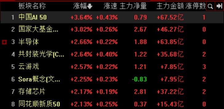 从板块涨幅来看锦盈多,中国AI50以3.64%的涨幅领涨大盘,主力净量达0.79,主力资金流入67.52亿,显示出市场资金对该板块的积极追捧。国家大基金、半导体、共封装光学(CPO)等与AI关联紧密的板块也涨幅居前,分别上涨3.02%、2.66%、2.64%,凸显了科技与AI产业在市场中的强势地位。
