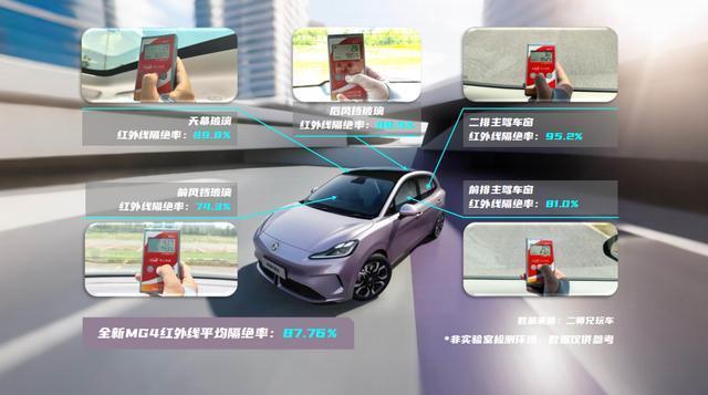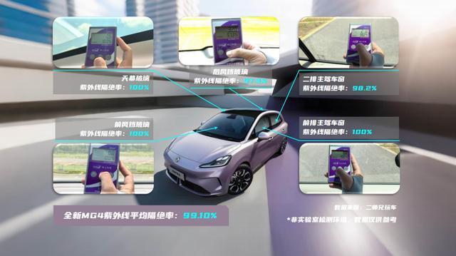而在全新MG4的测试过程中,这款预售起售价7.38万的新车超乎我们的想象。其前挡双层镀银玻璃与侧窗UV-IR涂层组成双重防紫外线屏障,实测前挡与前排侧窗紫外线隔绝率双双达到100%。与此同时,它的后排车窗紫外线隔绝能力,也表现出色,99.10%的紫外线综合阻隔能力,接近于小米SU7。
