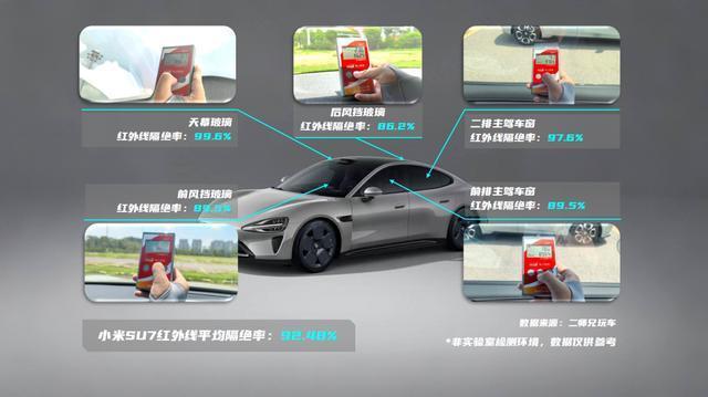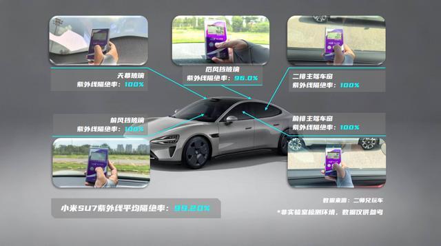 我们先从三款车中售价最贵的小米SU7说起,这款车的确有贵的道理。在三层镀银技术的加持下,这款车的前挡玻璃、天幕玻璃和前排主驾玻璃紫外线隔绝能力为100%。而即便是后侧窗和后挡风玻璃,也有不错的紫外线隔绝能力。最终,小米SU7以99.20的紫外线平均隔绝能力位居测试第一。